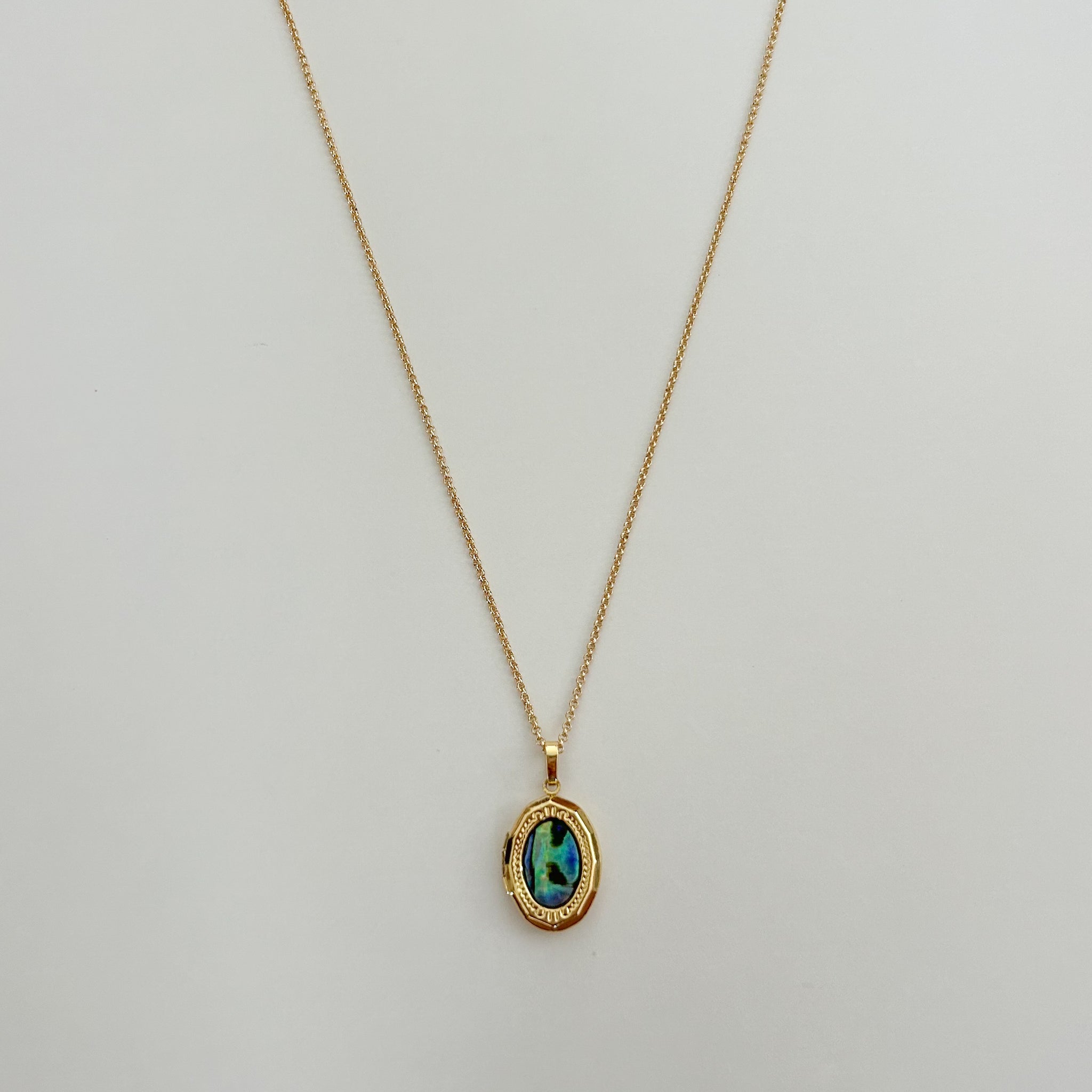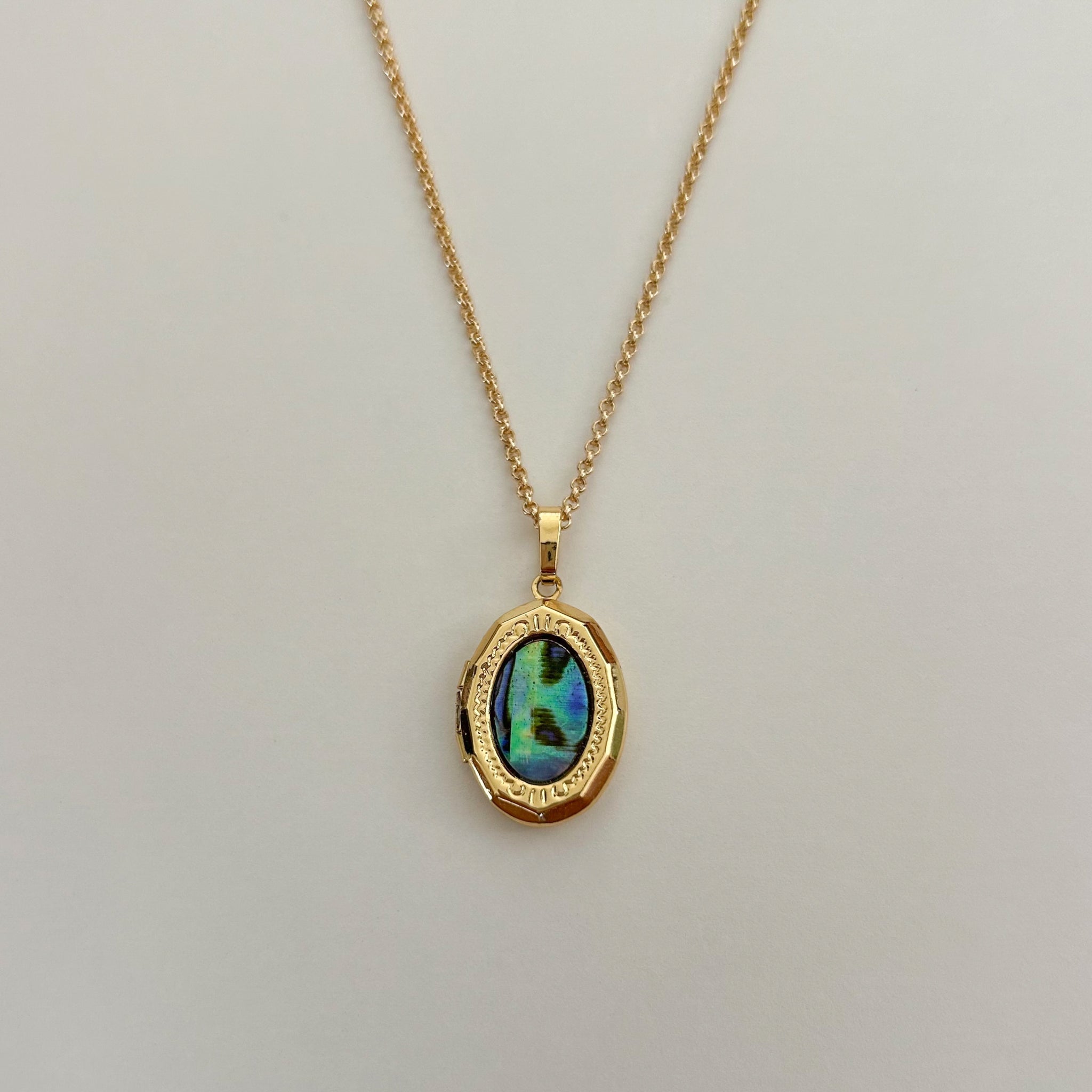 Abalone locket measures 29.9mm x 16.2mm. Rollo chain measures 2mm wide.