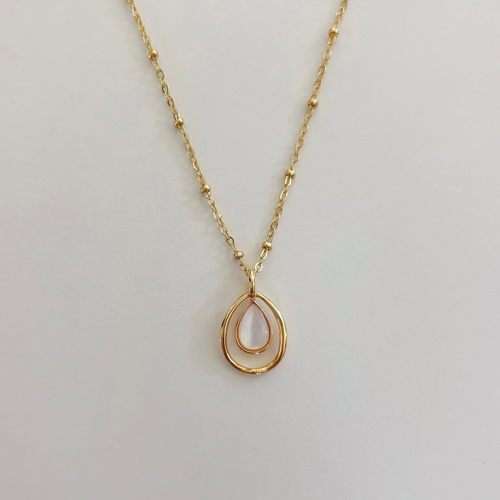 14K gold filled satellite chain and mother of pearl teardrop pendant.