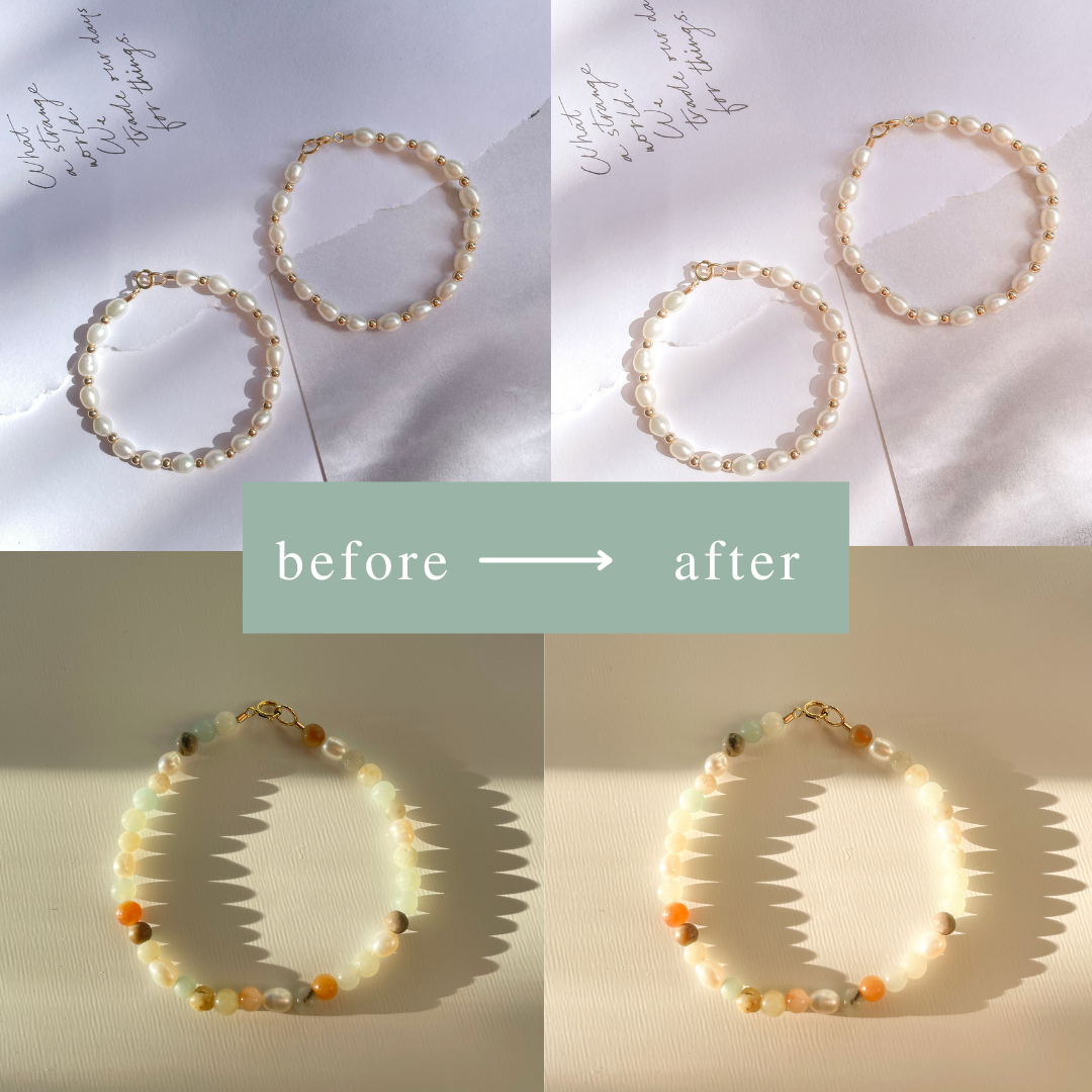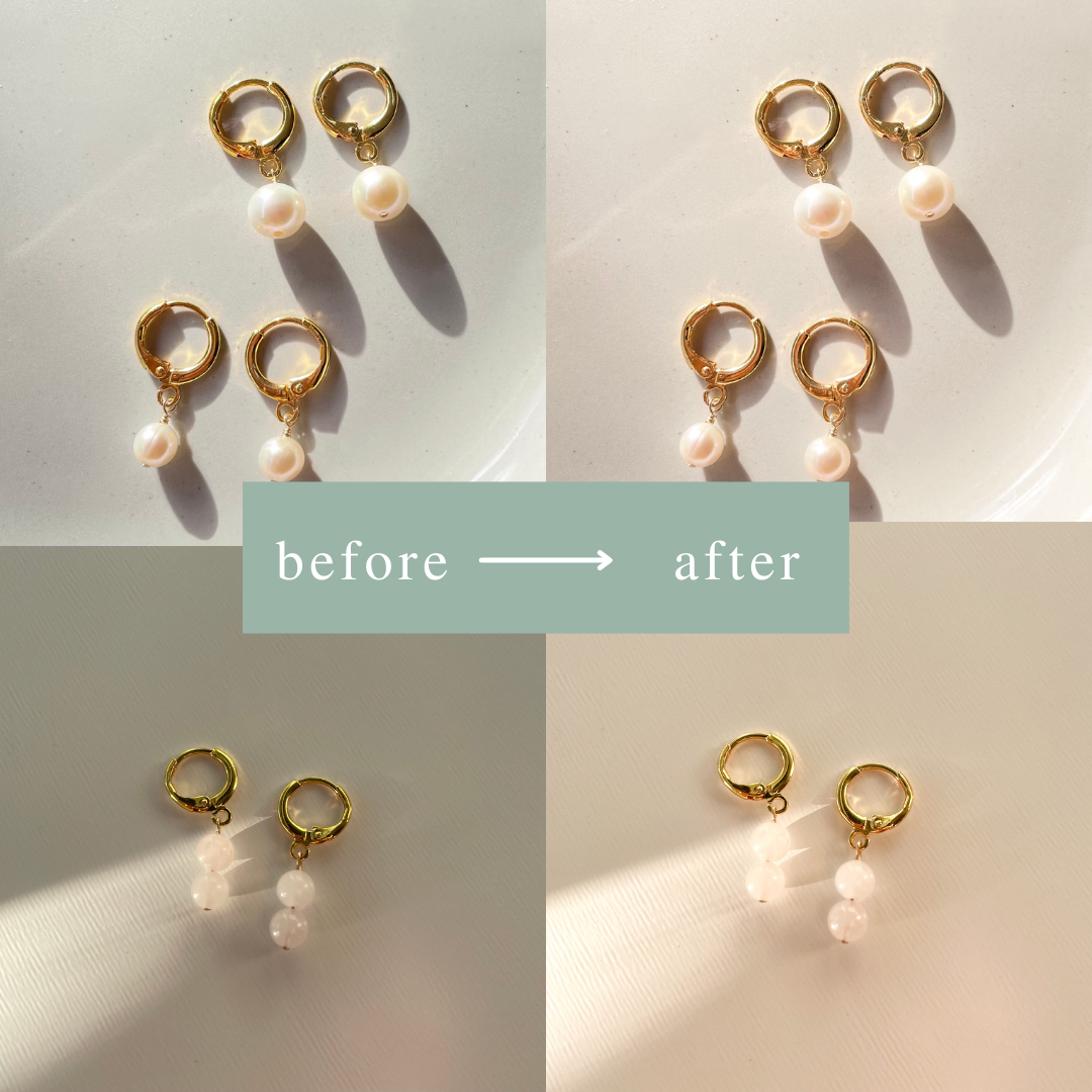 This preset works great on settle photos will dull lightning and plain (preferably all white) backgrounds. It was designed specifically for products that are neutral, not products consisting of any bright colors. The purpose of this preset is to brighten up your photos and increase warmth and hues for a crisp dewy appearance. The edits are strong and it works for most photos - adjustments can be made after applying the preset to tweak the photo to your liking. You save so much time on editing and your photos quickly go from a more grey scale to bright but natural in one simple tap!